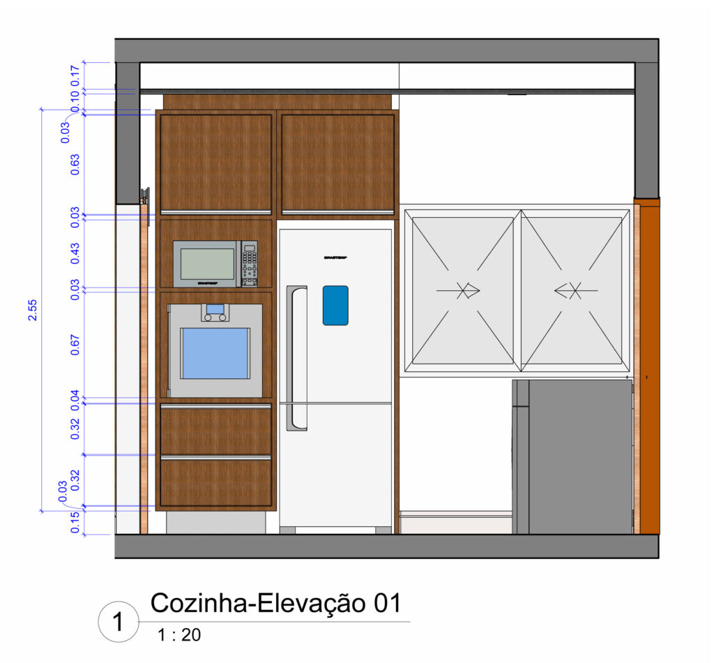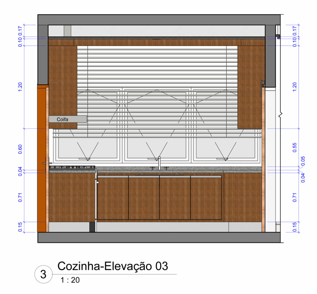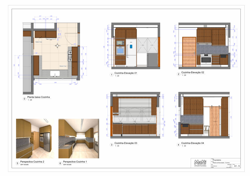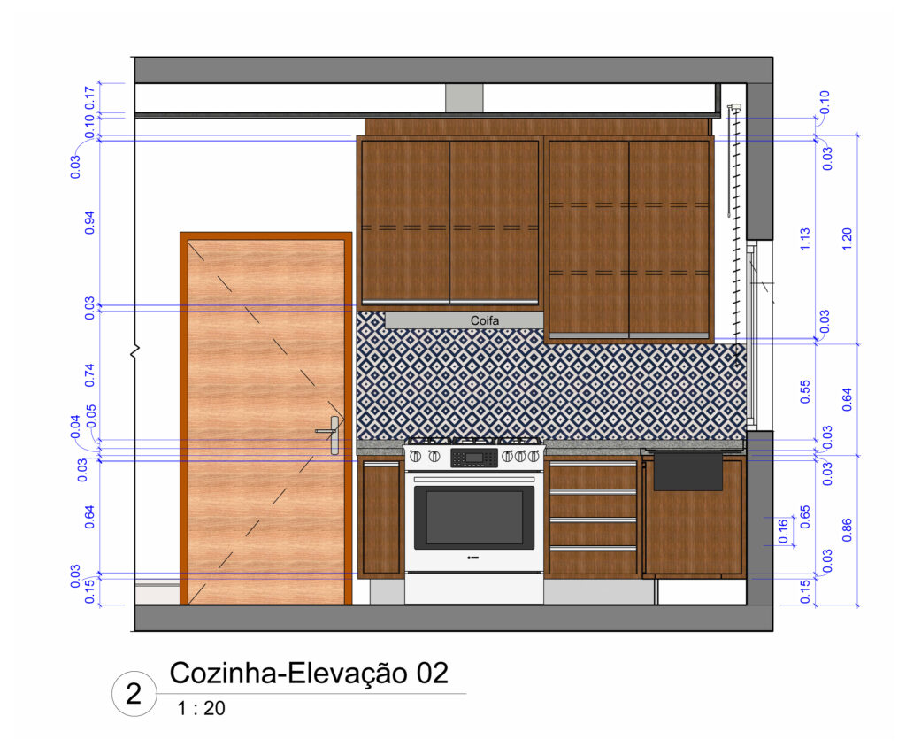 Projeto de cozinha planejada, incluindo organização dos módulos, armários superiores e inferiores e detalhamento técnico.