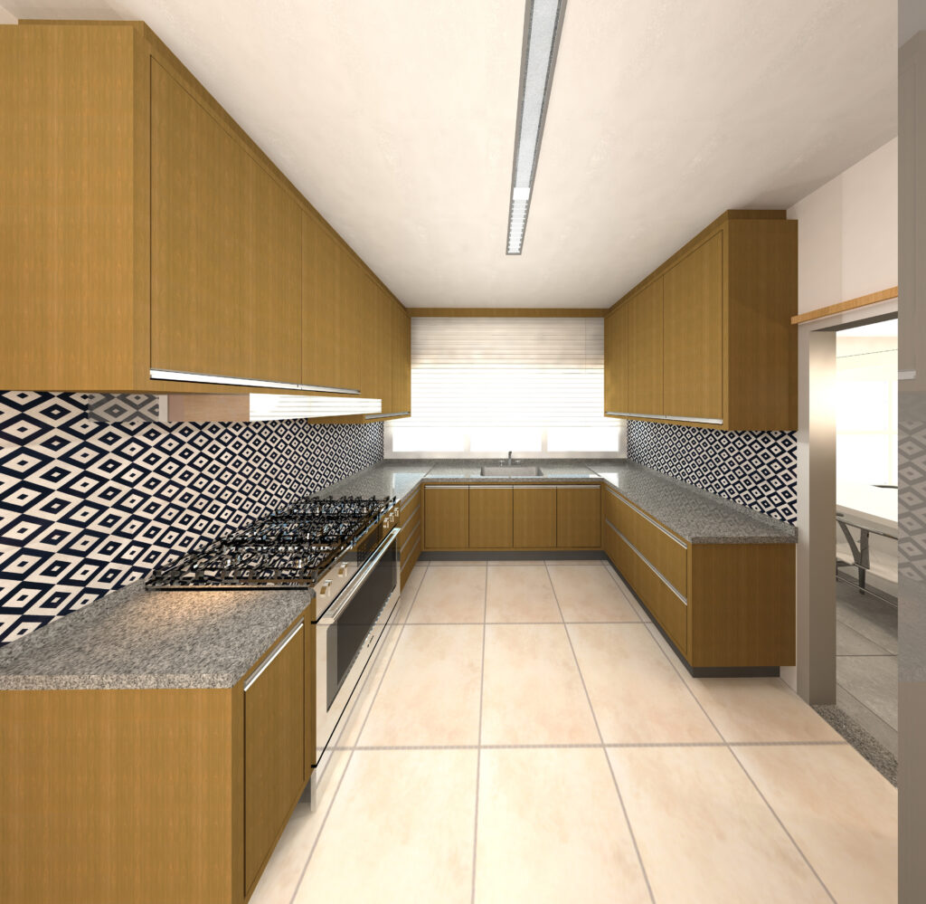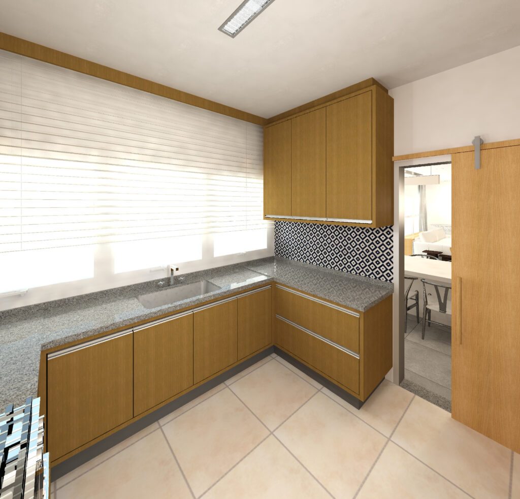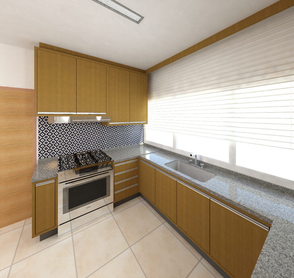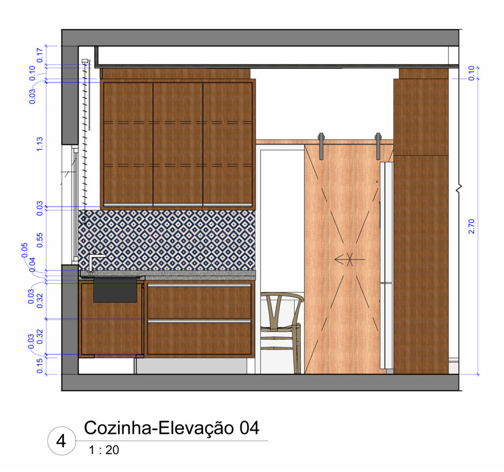 Projeto de cozinha planejada, incluindo organização dos módulos, armários superiores e inferiores e detalhamento técnico.