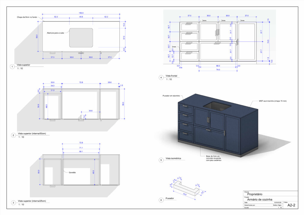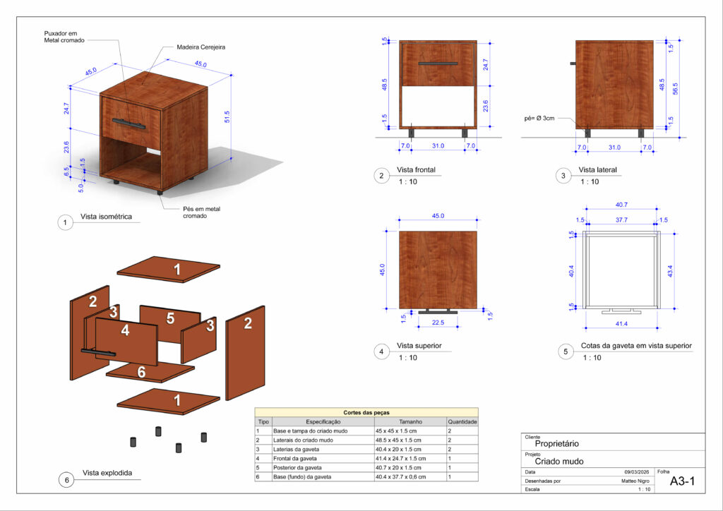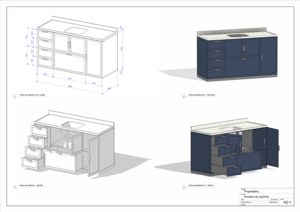 Desenvolvo projetos de marcenaria sob medida, incluindo modelagem 3D e desenhos técnicos para a fabricação e montagem dos móveis.